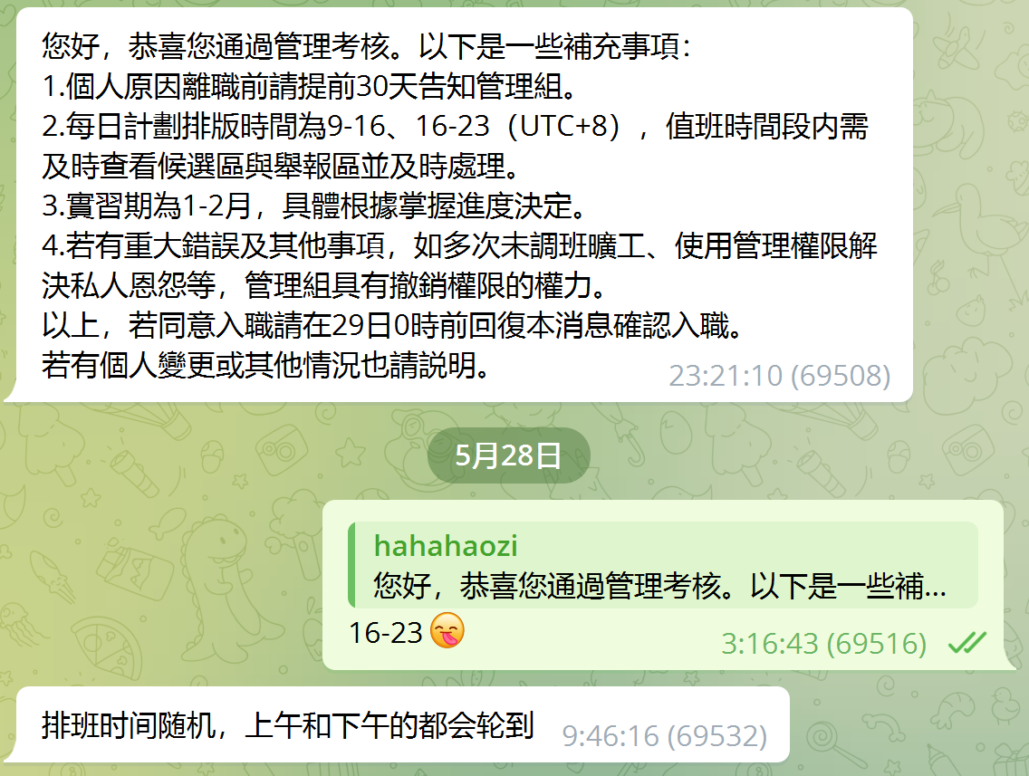 实际上在所谓面试开始之前我就提出 “(其实只是想看看)” “挺无聊的 想看看你们那边的工作x” ,审核管理员当即就回复了 “好”